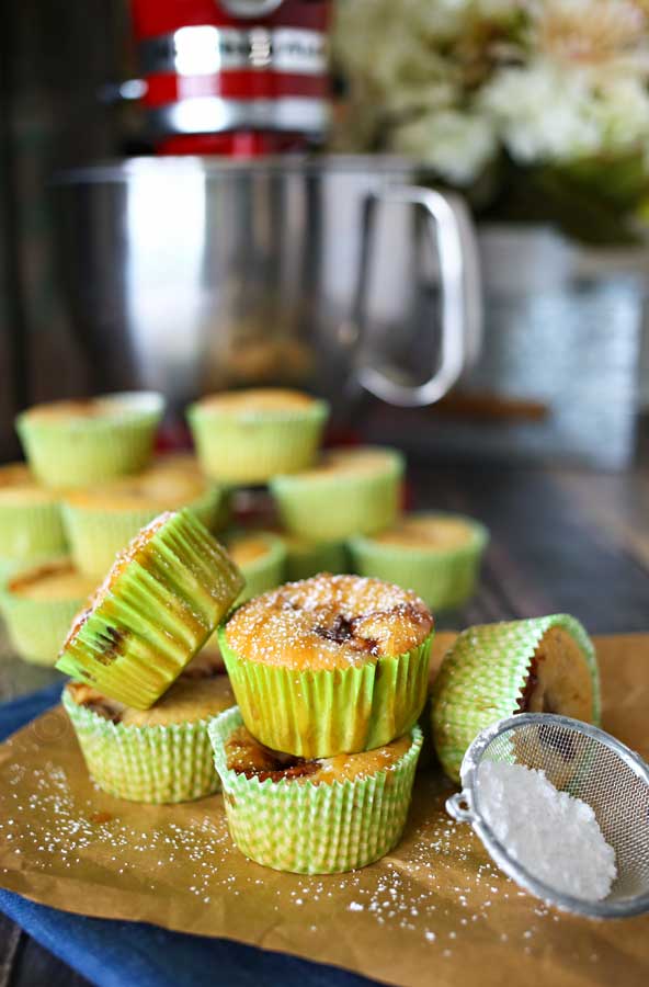 So I thought I would break out the ol’ KitchenAid Stand Mixer & whip up some Apple Fritter Cupcakes. They are really simple to make, line your tins, whip up your batter, fill your wrappers & add a little dollop of pie filling & bake. That simple!