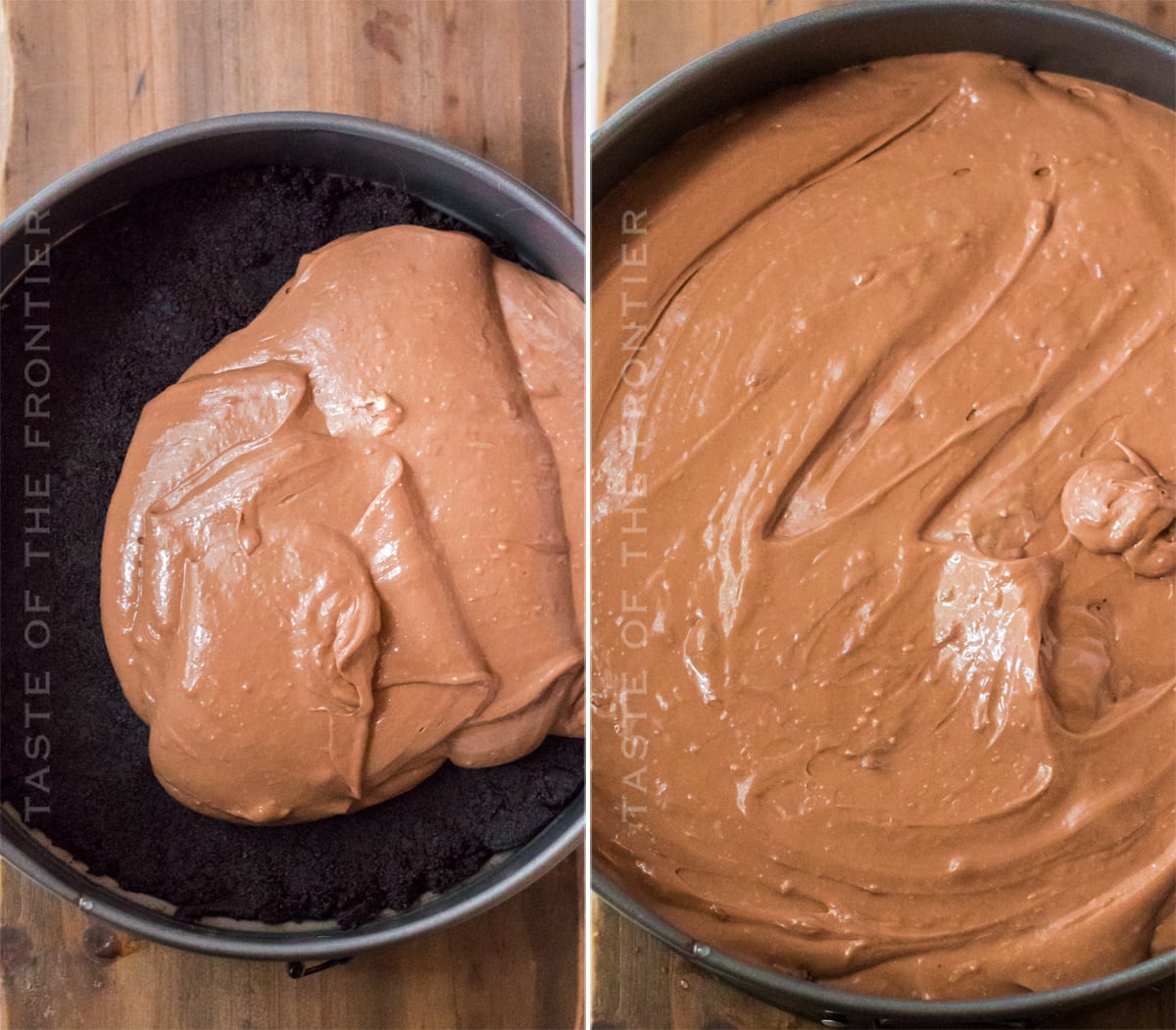 - Pour the creamy chocolate mixture over the top of the cheesecake.