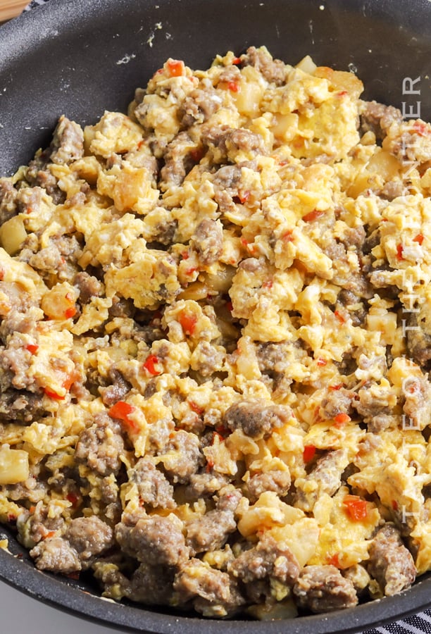 - Pour the wicked eggs into the skillet with the sausage and hashbrowns and cook until set, stirring frequently.