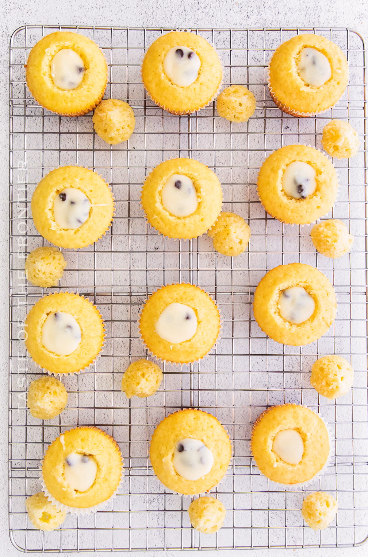 - Fill each cupcake with 1 tablespoon of cannoli filling and place the top of the cake back on top of the cannoli filling.