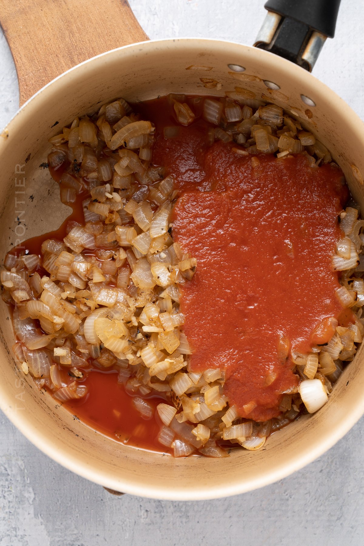 - When the garlic becomes fragrant, pour the tomato puree, dried Italian herbs, salt, and sugar into the pan with the onion mixture.