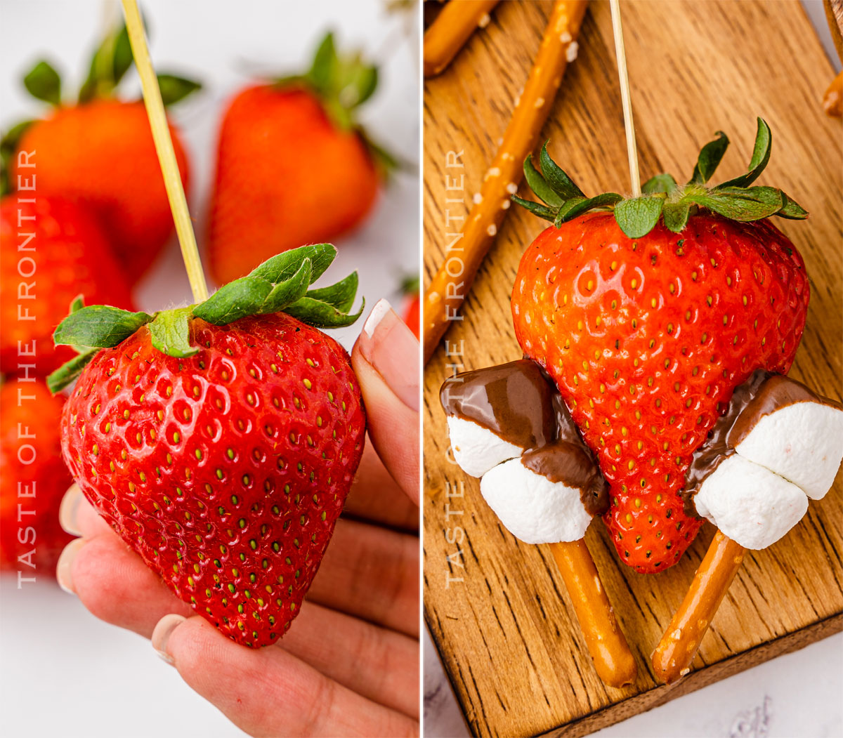 - Rinse the strawberries thoroughly and pat them dry with a paper towel. Then, press a cocktail skewer vertically into the top of each strawberry, but do not go all the way through.