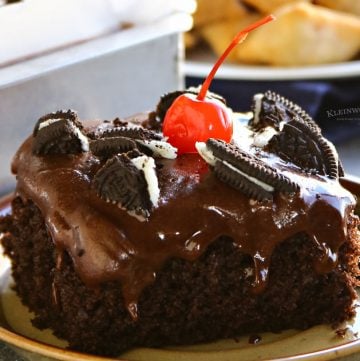 This week the family really wanted my classic Cherry Coke Cake. But this time I decided it would be even better if I added OREO Cookies on top. Man, that was a great idea. SO GOOD! The added maraschino cherry juice just adds a hint of cherry to the chocolate cake. Then melting the frosting for a few seconds in the microwave makes icing this cake a breeze. Just heat & pour, you almost don’t even have to spread it at all, which is a huge win for me. You just can’t go wrong with this super easy & delicious cake! It’s always gone before the game or race is over.