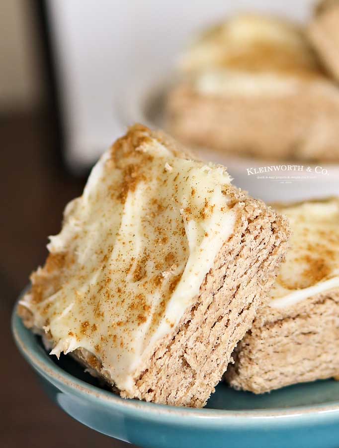 - Spread frosting in an even layer & sprinkle with a little cinnamon/sugar mixture.