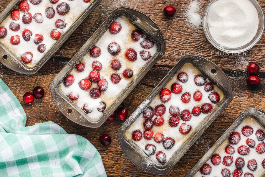 - Add fresh cranberries to the top and then sprinkle with about ¼ cup of the sugar (divided between all of the loaves)