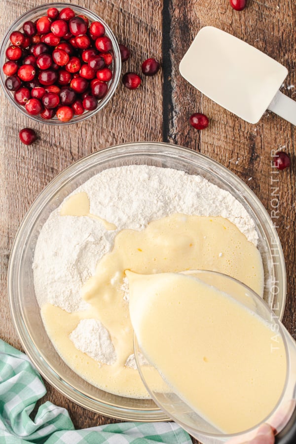 - Add the milk, eggs, and oil together in a large measuring cup, whisk to combine, and then pour it into the dry ingredient mixture.