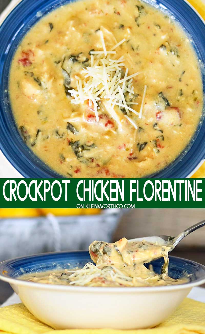 Crockpot Chicken Florentine, an easy & delicious soup made in your slow cooker. Loaded with chicken, spinach & cheese, this is soon to be a family favorite.