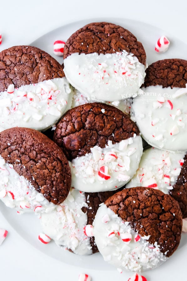 Fudgy chocolate cookies dipped in white chocolate & sprinkled with crushed peppermint make these insanely DELICIOUS Double Chocolate Cookies that are just perfect for the holidays!