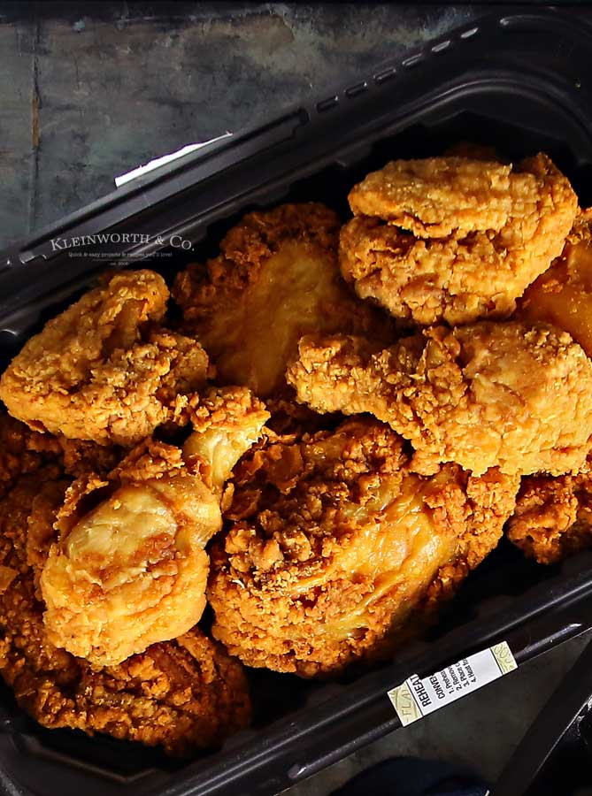 If I am tight on time, I usually just leave the fried chicken or the tenders in the plastic container that they come in from the deli & refrigerate them. But you can place them in any airtight container and just keep refrigerated until you are ready to serve again.