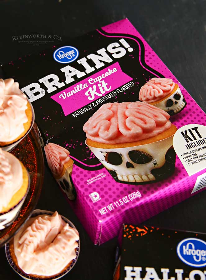While I was picking up sprinkles and cupcake wrappers and fun monster eyes, I found these super cool Halloween Sugar Cookie Kits and Brains! Vanilla Cupcake Kits from Kroger Brand.