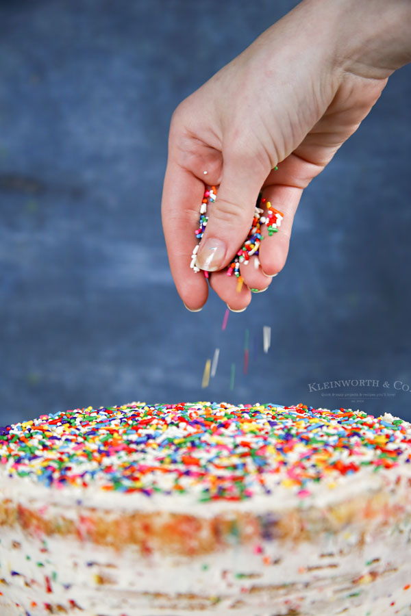 I have made it my mission to try something new when it comes to cake each year for her birthday. For this, I took her basic white cake recipe & altered it a bit & then added the rainbow jimmies. I was quite pleased with the result.
