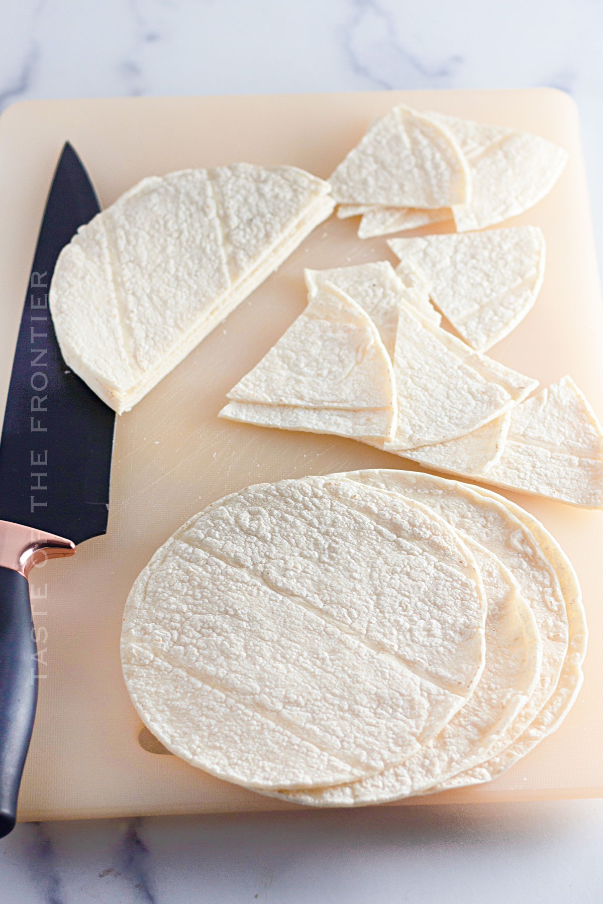 - Cut the tortillas into wedges using a knife or kitchen scissors.