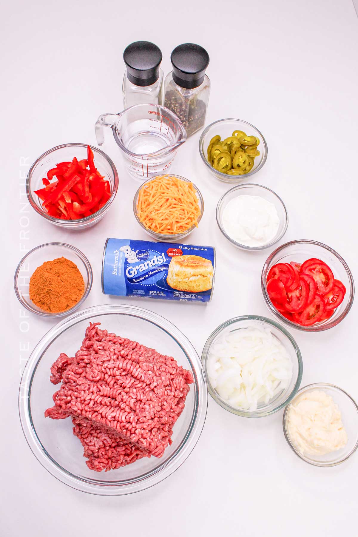 - Layer over the pre-baked biscuit crust in this exact order: the cooked ground beef mixture, tomato slices, remaining onion and bell pepper mixture, jalapeño peppers (if using), and the sour cream mixture.