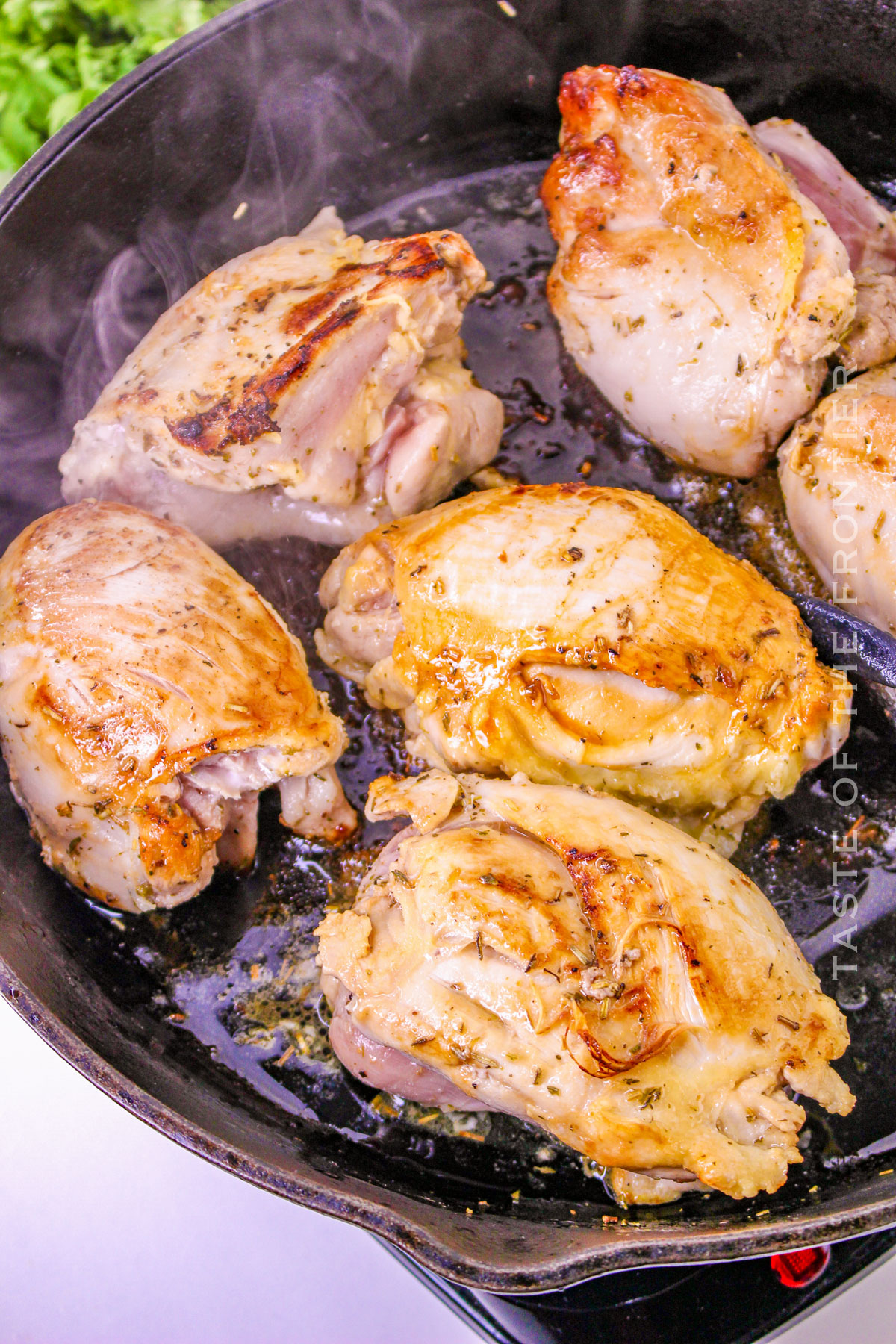- Heat a skillet over medium-high heat. Add the oil and heat until hot but not smoking. Sear the chicken thighs on each side until golden brown.