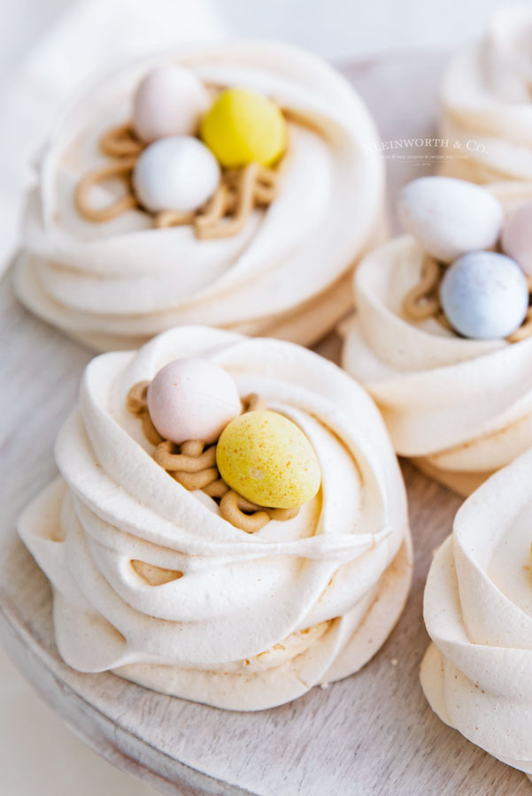 These are basically a personal size pavlova since they are a bit larger than a meringue cookie, but then we add the buttercream frosting to make it look like twigs. It also helps to keep those Cadbury eggs in the nest until ready to enjoy.