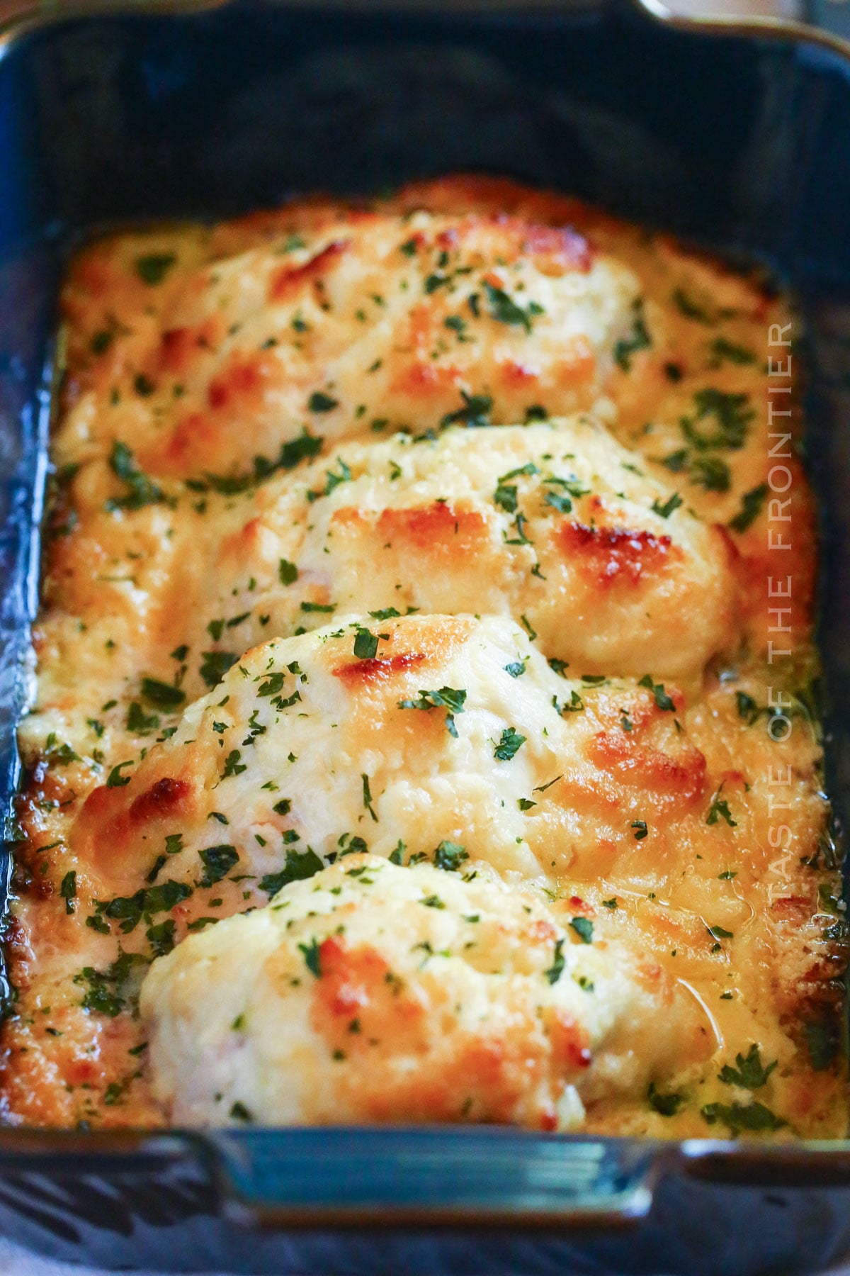 Made with tender chicken breasts covered in a delicious layer of flavorful cheese, it’s seasoned with garlic and baked to golden perfection.