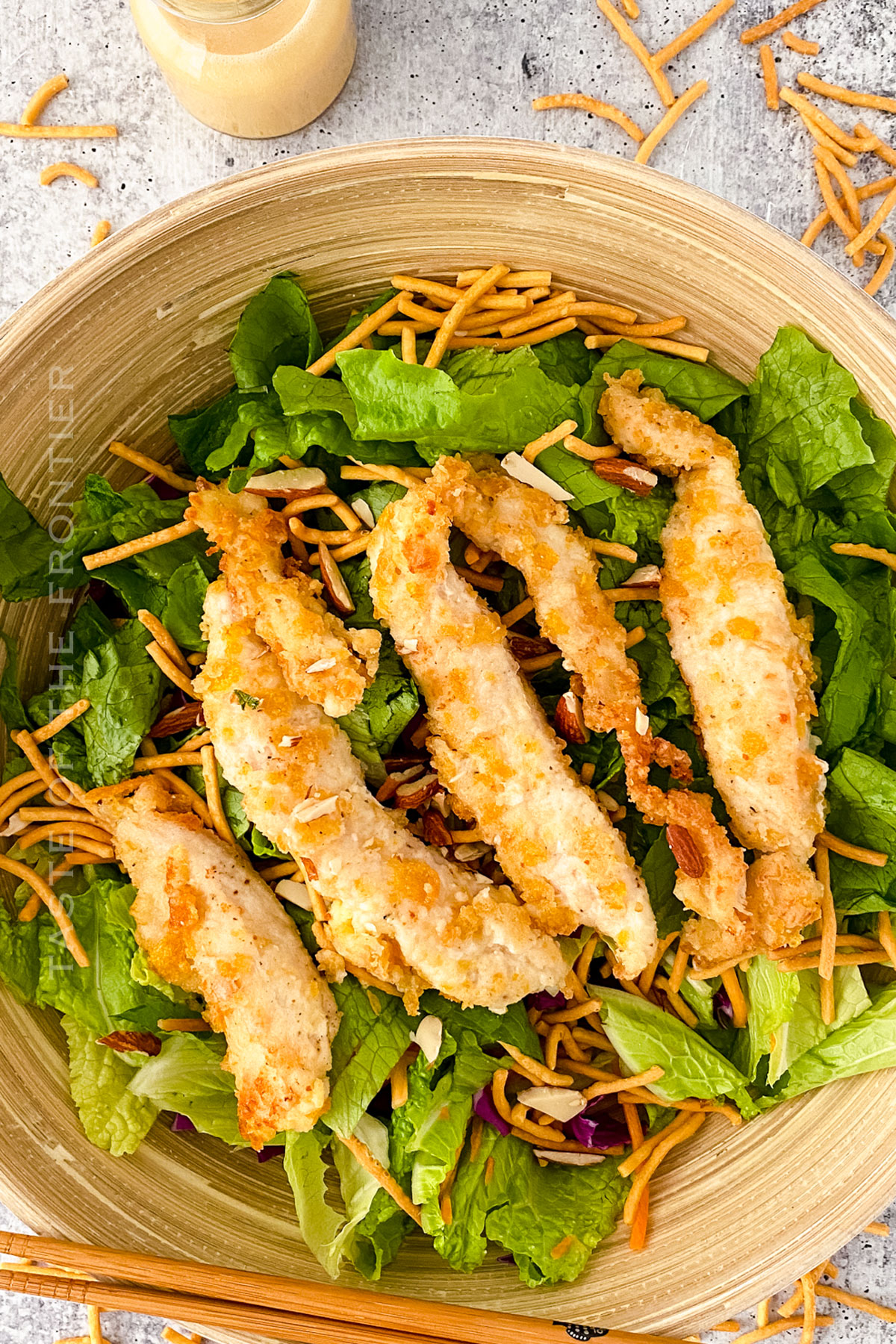 Lots of greens and veggies along with pan-fried chicken strips are the main stars of the show in this salad.