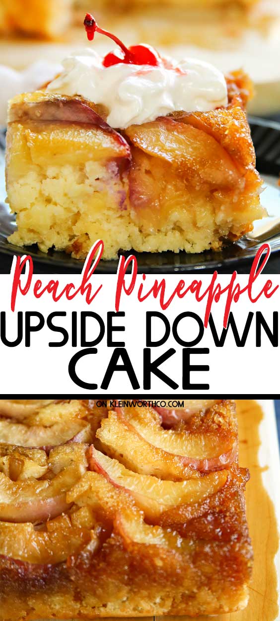 “Peach Pineapple Upside Down Cake is a delicious twist on the classic pineapple dessert. Moist cake with a sweet, caramelized outer layer is a favorite.”