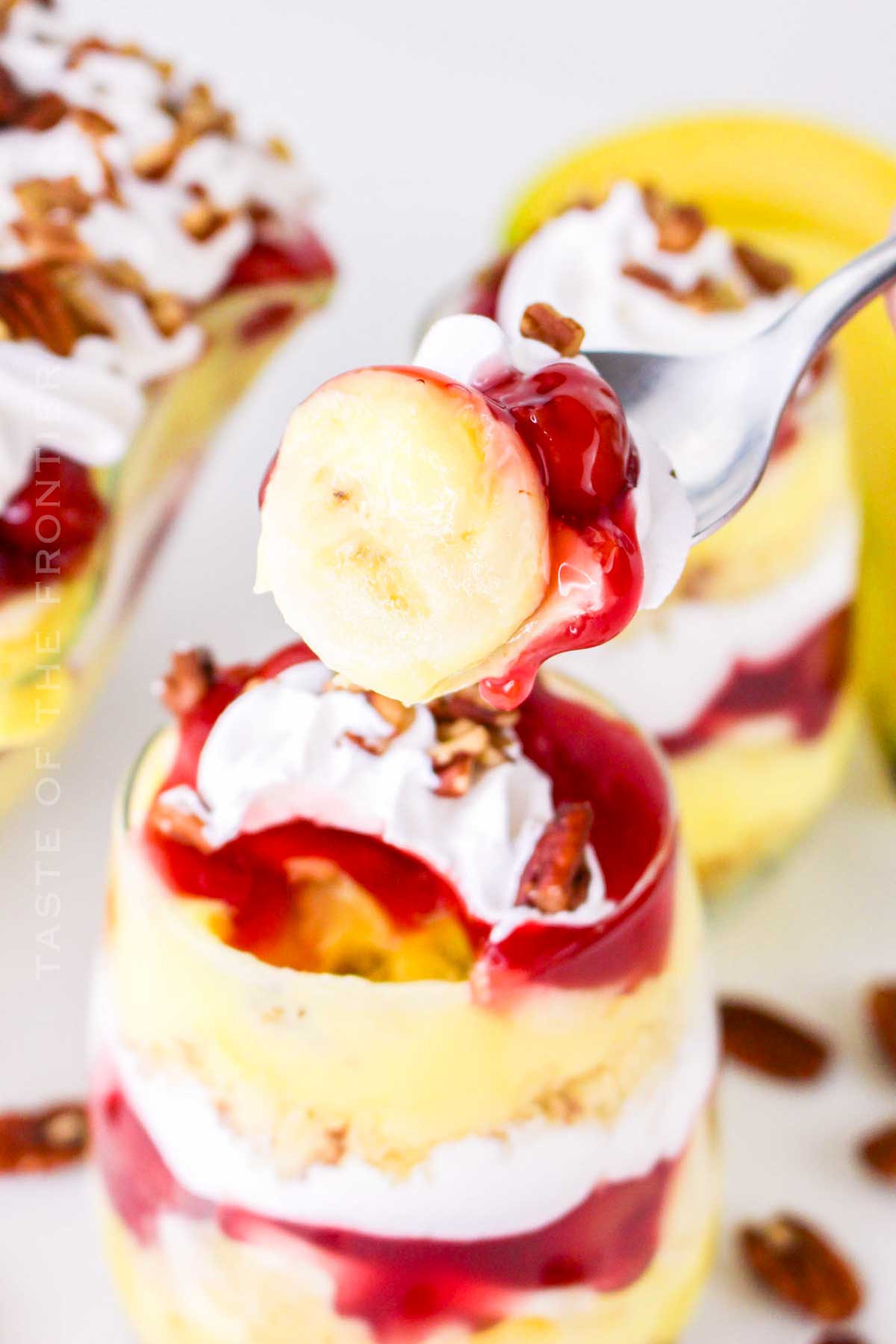 - Repeat the layers with the remaining cake, pudding, pineapple, banana, cherry pie filling, and whipped topping.