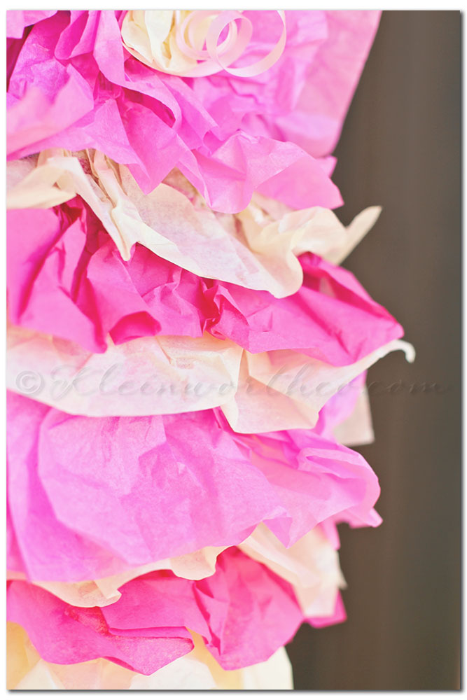I didn’t have orange tissue paper on hand to keep with the true yellow, pink & orange sorbet colors of the party decorations. So I just used 2 different shades of pink. I did all of this with things I had on hand here at the house. I broke it all down by doing the construction on the first afternoon- total time maybe 30 minutes. Then the next afternoon I worked for maybe 1-2 hours (including photos) adding on the tissue paper.