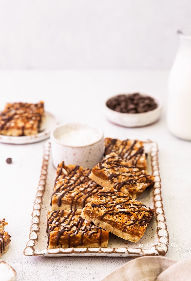 This bar recipe is super simple to make too. Check it out. If you are a lover of the Samoa cookies – you will love these bars.