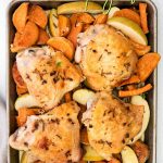 Sheet Pan Chicken Thighs made with apples and sweet potatoes is a quick, easy, and healthy way to get dinner on the table.