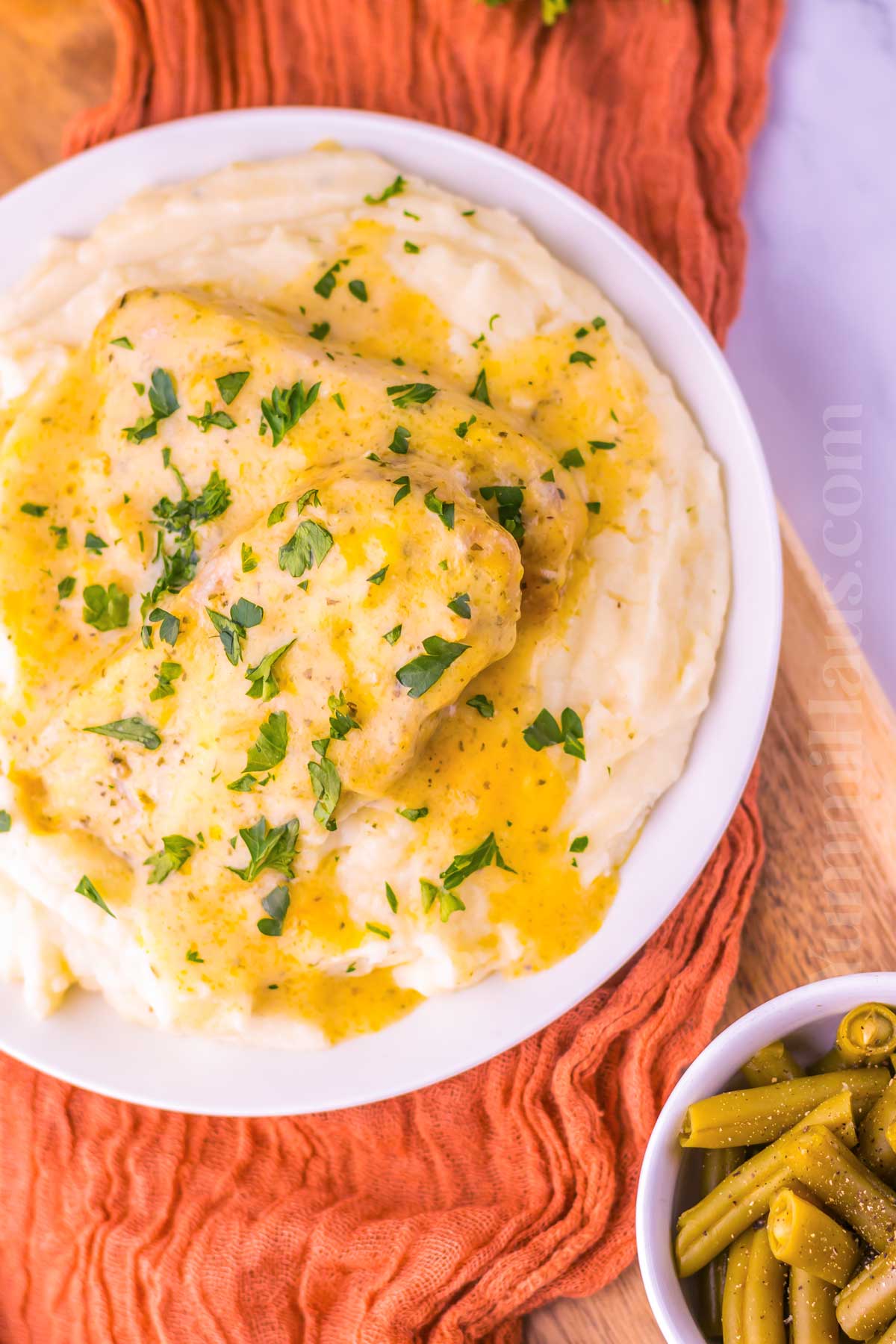 - Serve with mashed potatoes and some of the gravy drippings on top.