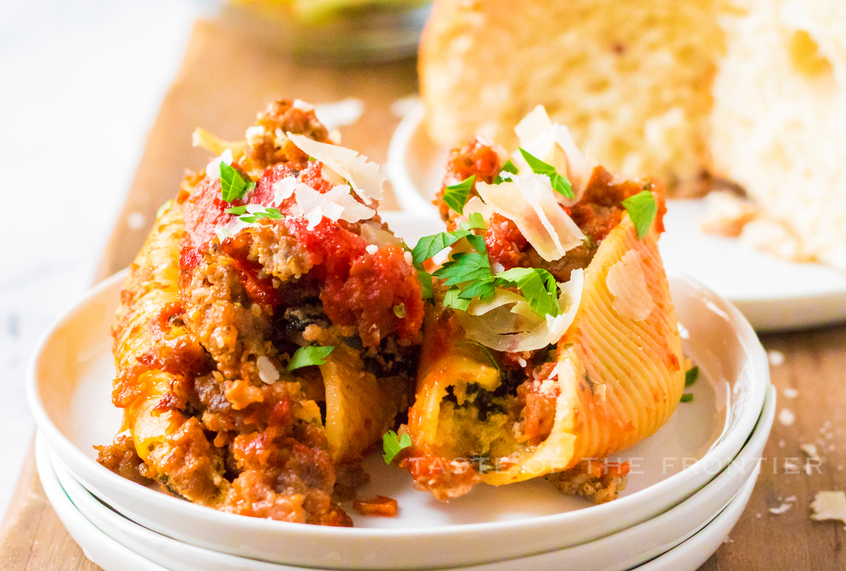 I personally don’t like to freeze pasta because of what it does to the texture. However – my friends say that if you transfer the cooked shells to a foil pan, cover with the remaining sauce, and then cover before freezing – you can freeze for up to 4 months. To bake from frozen, just place the frozen pan in a 350-degree oven and cook for about 1 hour with the foil on.