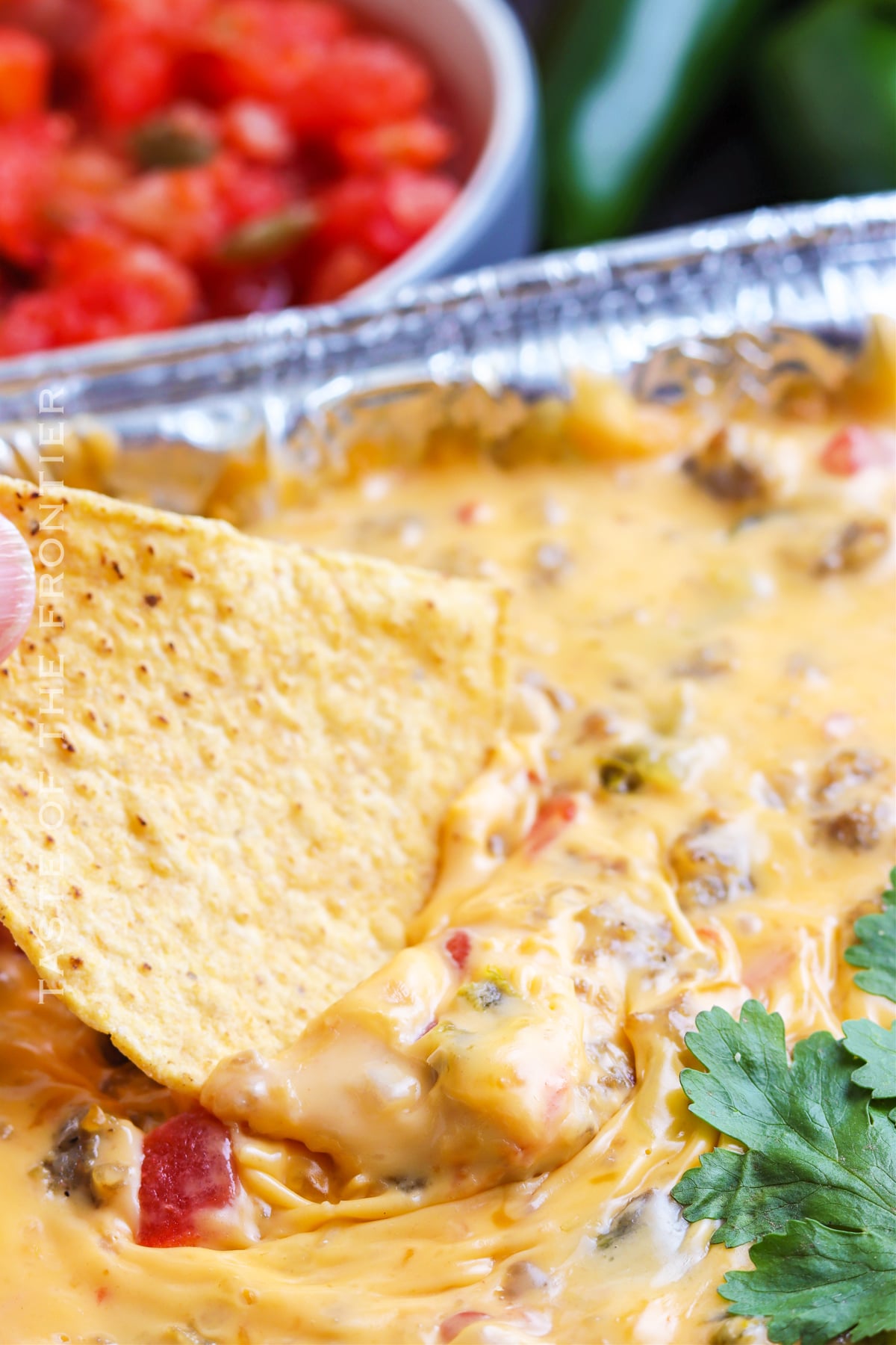 Smoked queso dip is typically served with tortilla chips, crackers, or bread. It can also be used as a topping for burgers, tacos, or nachos. I like to put it on EVERYTHING!