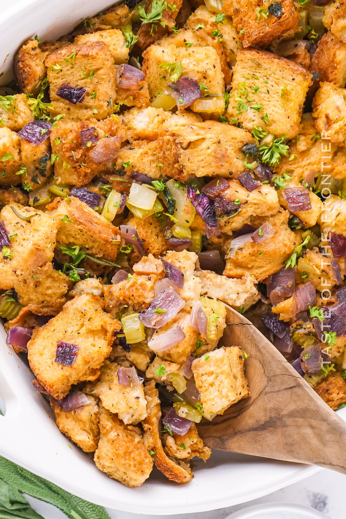 I love the crunch of the celery and red onion in this stuffing. Every single ingredient on this list comes together with the rest to create something amazing. It’s one of my favorite recipes for Thanksgiving!