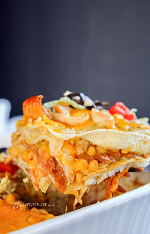 It has all the things you love about tacos, corn tortillas, beans, juicy shredded chicken, sauce, cheese, tomatoes, olives, corn & sometimes I like to add some black beans in there too. When serving you can add a bit of shredded lettuce & a dollop of sour cream to really take it over the top.
