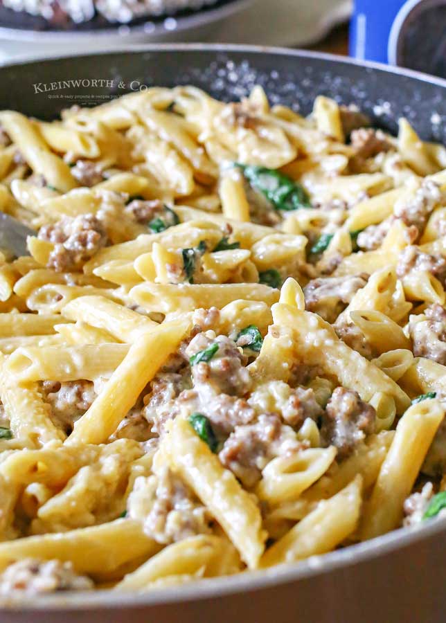 One skillet dinners are where it’s at! It’s so easy that it makes getting creative even more fun. For instance, chicken & alfredo is the usual pairing. But with this, I chose to do ground sausage instead.