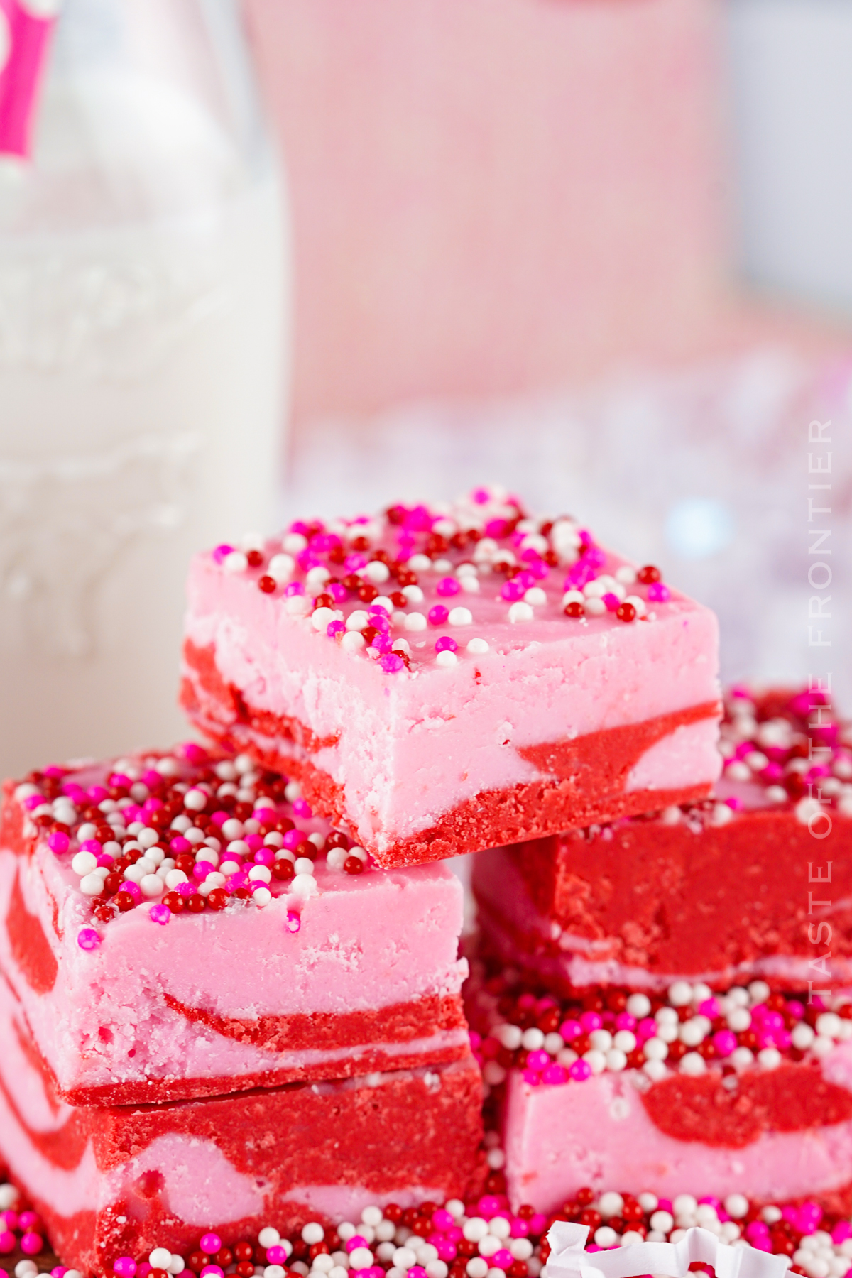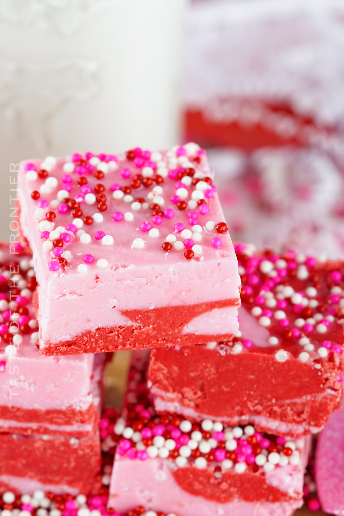- Once all of the chocolate mixtures have been poured into the pan and evened out, sprinkle the top of the fudge with as many Valentine-themed non-pareils as you like.