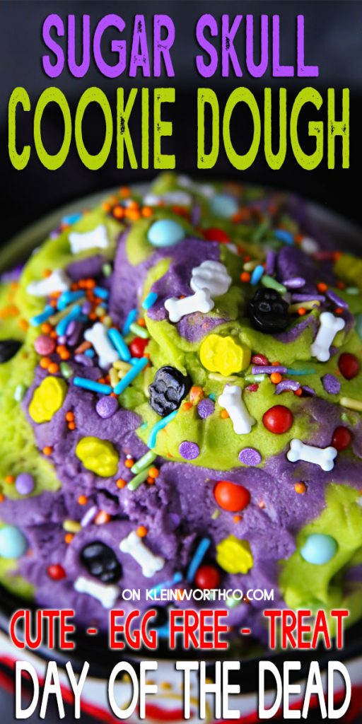 Sugar Skull Cookie Dough is a quick and easy Halloween treat. Green and purple egg-free cookie dough loaded with sugar skull sprinkles is a perfect Day of the Dead dessert.