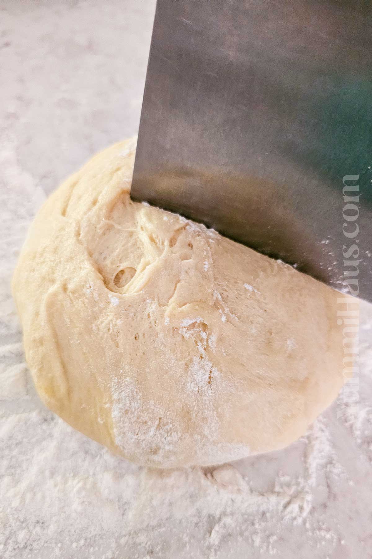 Transfer to a flat, lightly floured surface and knead for 8-10 minutes, until the dough is smooth and has an elastic texture. (the kneading is what forms the gluten – giving the rolls that soft, airy, chewy texture)