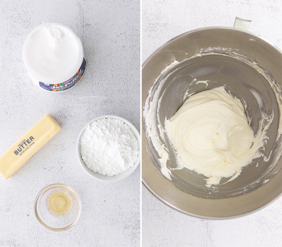 - In the bowl of a stand mixer fitted with the paddle attachment, beat the butter, confectioner’s sugar, and vanilla together on low speed until combined.